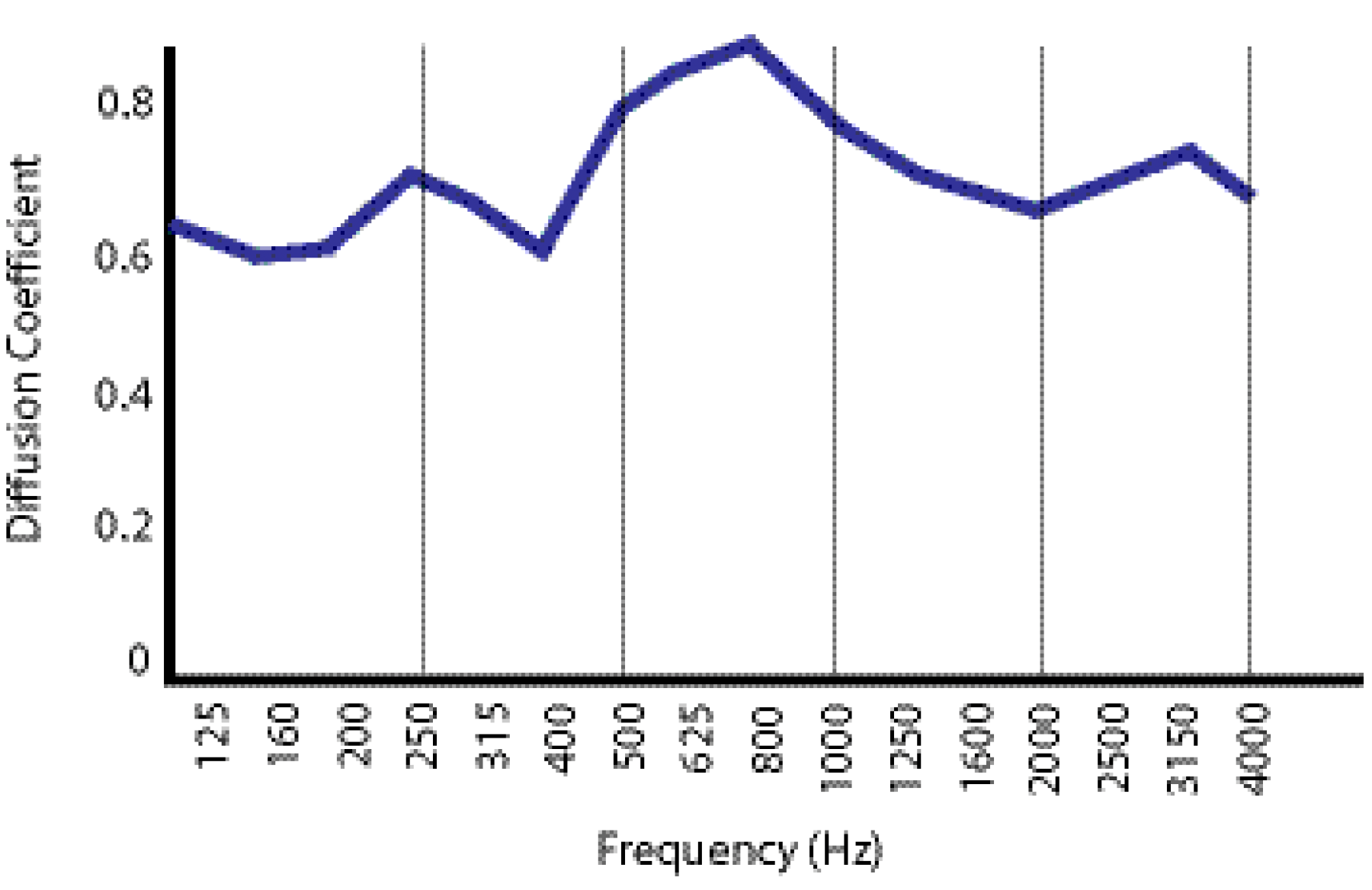 Diffusion Coefficients for the product were measured in accordance with the recommendations of the Audio Engineering Society Working Group SC-04-02 boundary measurement technique. The directional diffusion coefficient is given by the standard deviation of the 1/3-octave polar response, for a given angle of incidence, and normalized by the response of a flat panel of similar size.
