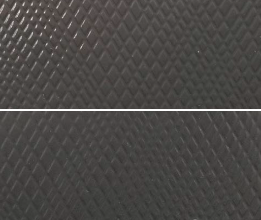 Linear designs are the most affected, especially on parts with complex geometries or deeper draws. Texture stretch and distortion are less noticeable in random designs, which are preferable for parts with deep draws or complex geometry.