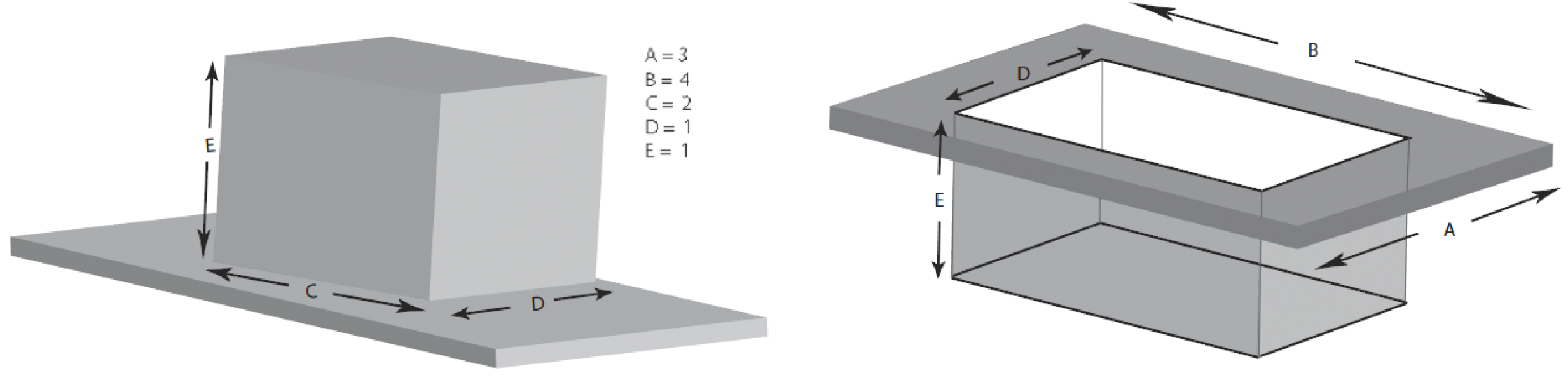 If the same part was to be formed using a female mold, the sheet would first contact area A x B – C x D, resulting in a flange with a heavy wall thickness and leaving only area C x D for forming the total cavity area, E(2C + 2D) + C x D. The thinning that will occur is calculated as follows: