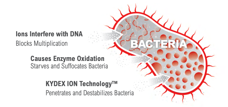 New KYDEX ION Technology™ is 99% effective at inhibiting the growth of stain and odor causing bacteria on KYDEX® Thermoplastics. KYDEX ION Technology™ interferes with bacteria DNA, which prevents stain and odor causing bacteria from multiplying on the treated thermoplastic sheet.