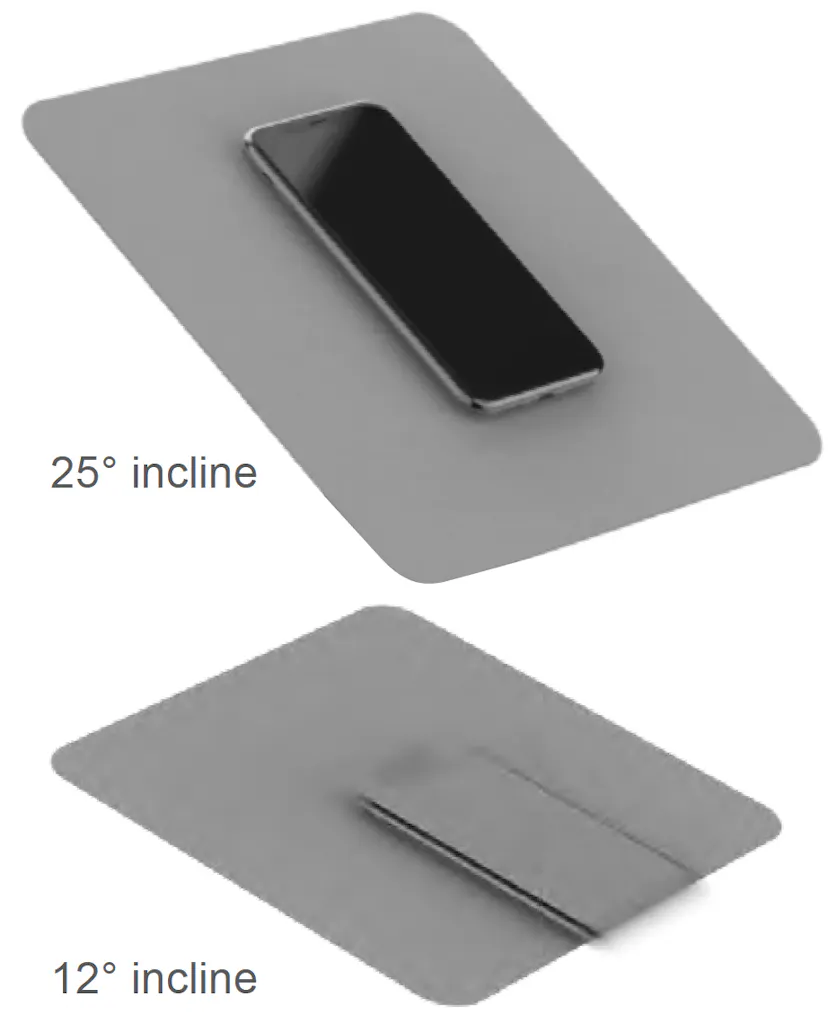 surfaceGrip™ technology will hold items, like a phone, in place when the surface is at a 25° incline, compared to a 12° incline for surfaces without surfaceGrip™ technology.