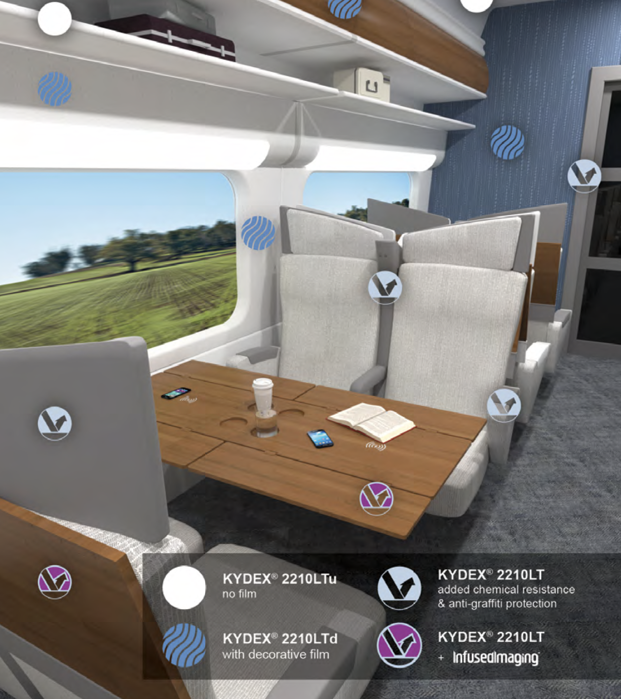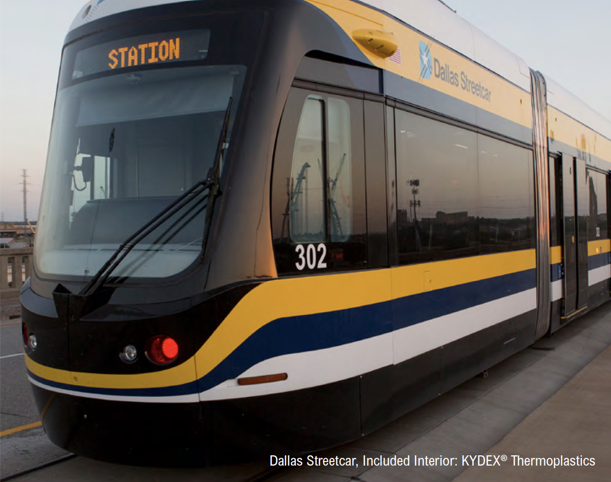 KYDEX® Thermoplastics offer ample design flexibility, while meeting the most stringent fire, smoke, heat release, and toxicity requirements, providing a fully-compliant portfolio to meet all of your rail application needs.