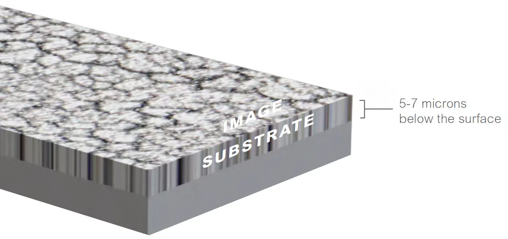 Durability is enhanced because it does not chip, fade, or delaminate the way capped and traditionally printed images