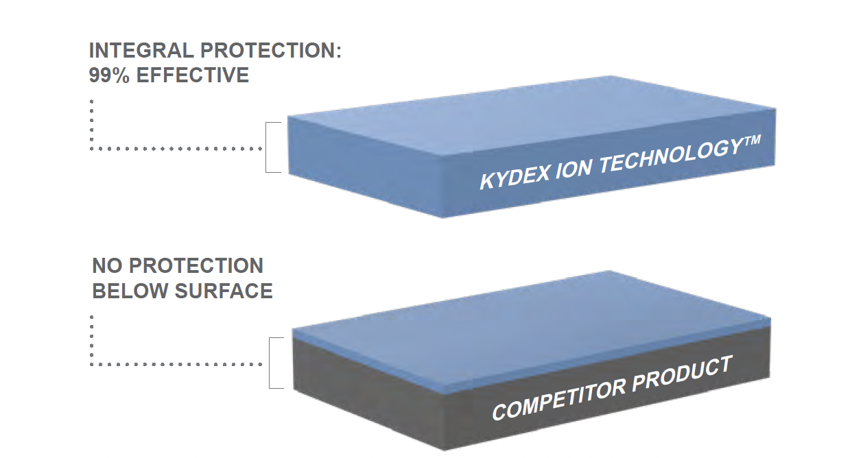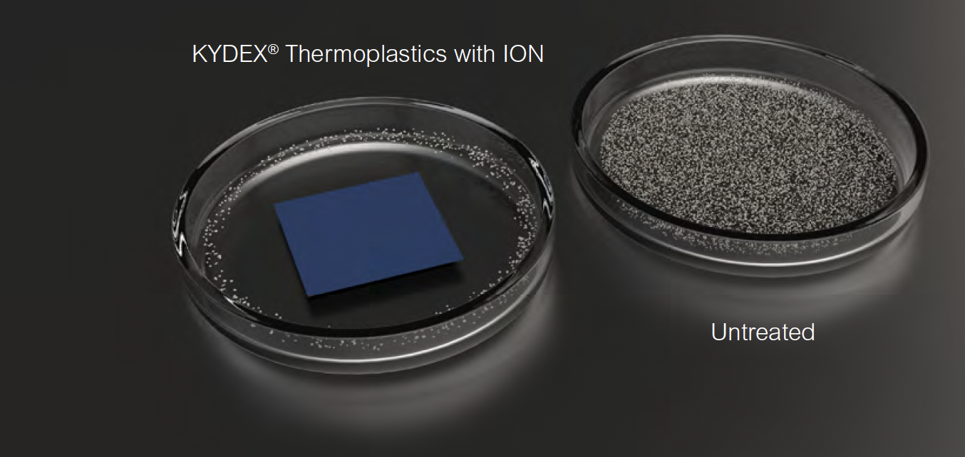 KYDEX® Thermoplastics are inherently antimicrobial and available with additional antimicrobial protection. Premium KYDEX ION TechnologyTM are durable, chemical- and stain- resistant. They are easy to disinfect and are ideal for high traffic areas such as healthcare furniture and medical devices.