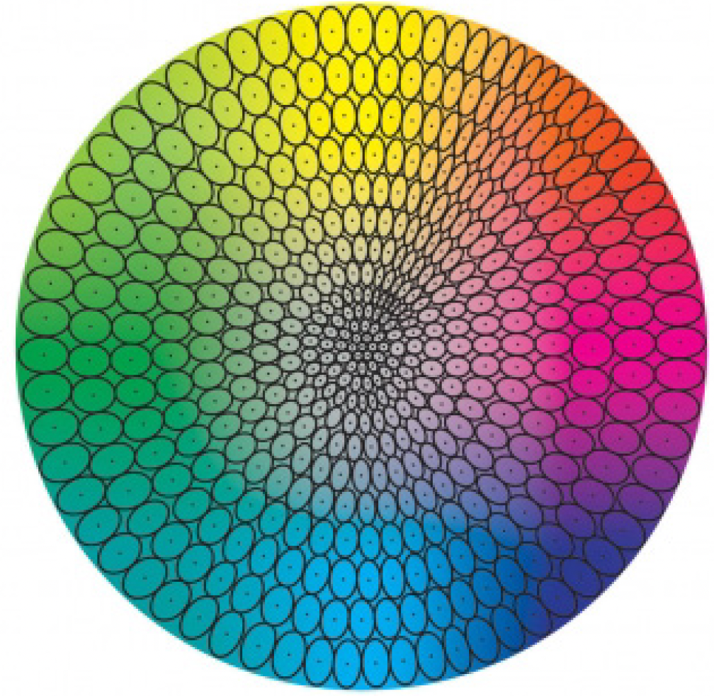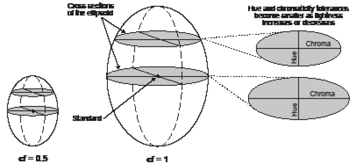The human eye does not detect colour differences in hue, chroma, or lightness equally. Various conditions including viewing conditions, eye fatigue, colour blindness, and colour memory can all affect the eye’s ability to distinguish colour differences. On average, the observer will recognize differences in the hue first, chroma second, and lightness third. The resulting visual acceptability from the eye’s ability to distinguish colour is best represented by an ellipsoid.