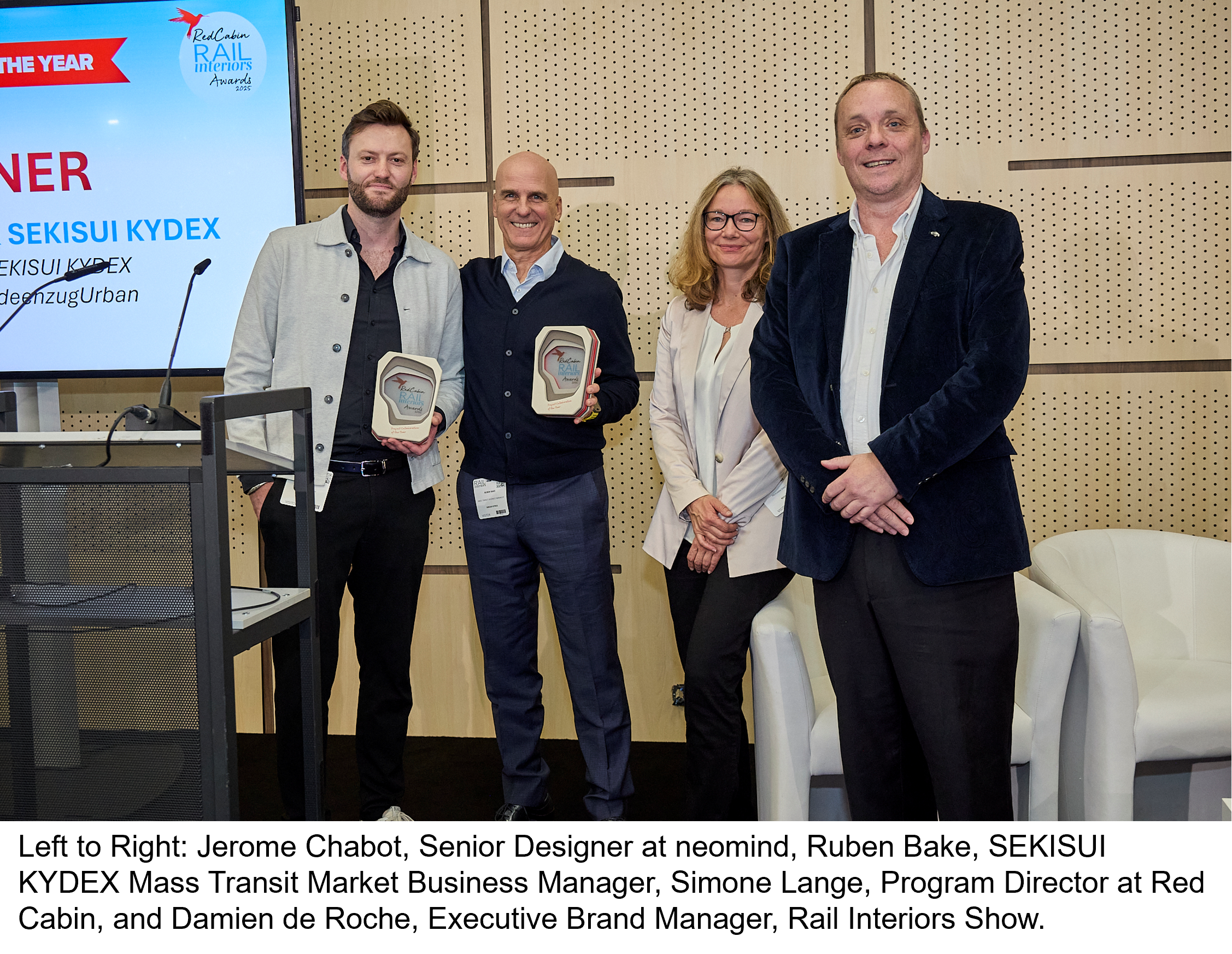 During the RedCabin Railway Interiors Summit held in Prague, Czechia, on November 25, 2026, neomind and SEKISUI KYDEX were presented with the inaugural Railway Interiors Award for Collaboration of the Year. The Railway Interiors Awards consist of six categories, each focusing on specific engineering or design disciplines. The categories prioritize passenger and driver comfort, security, sustainability, accessibility, durability, and aesthetics for rail cabins. While the Collaboration of the Year award focuses on collaboration, to win this category, judges are looking for a project that saw two or more companies successfully work together to create an innovative and stylish rail carriage on time and within budget.